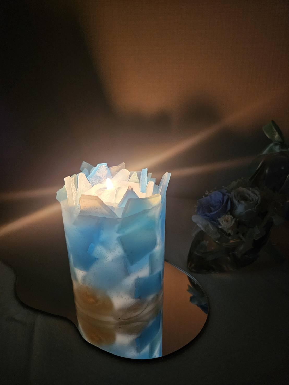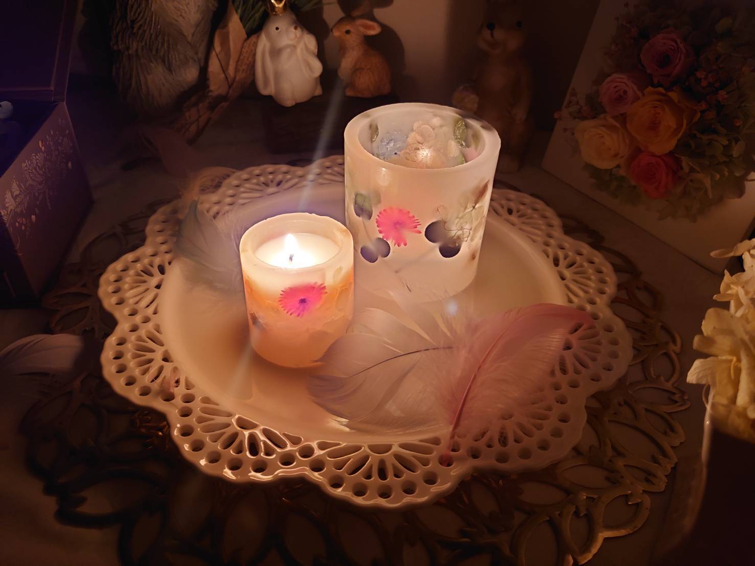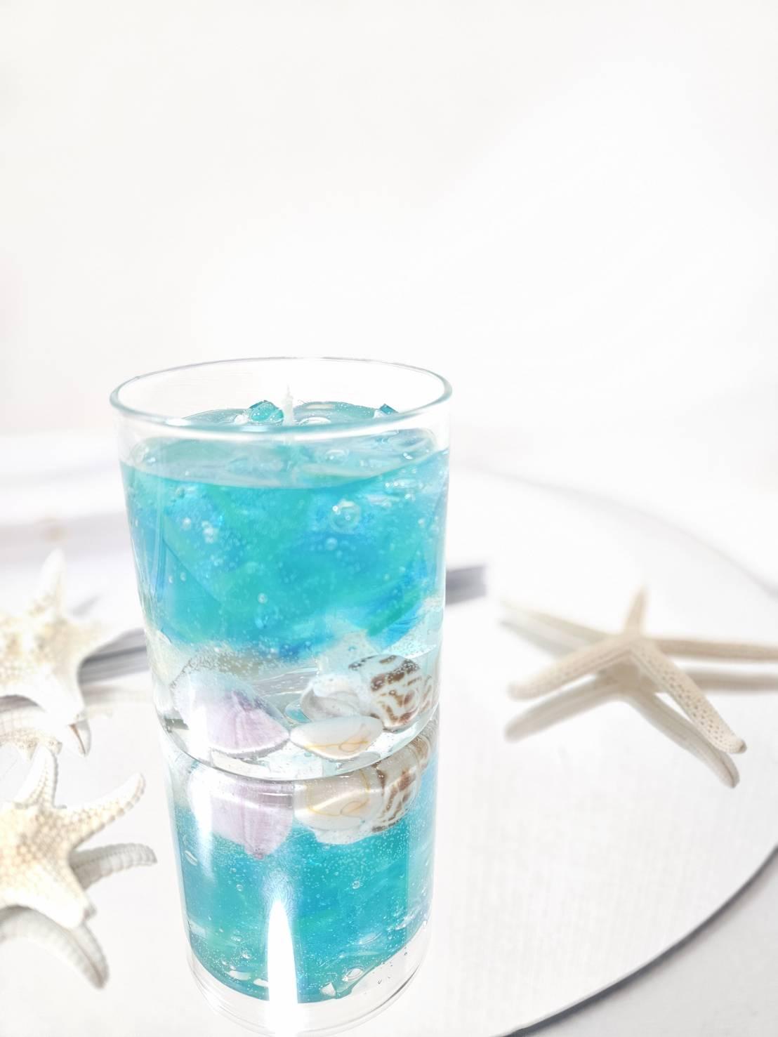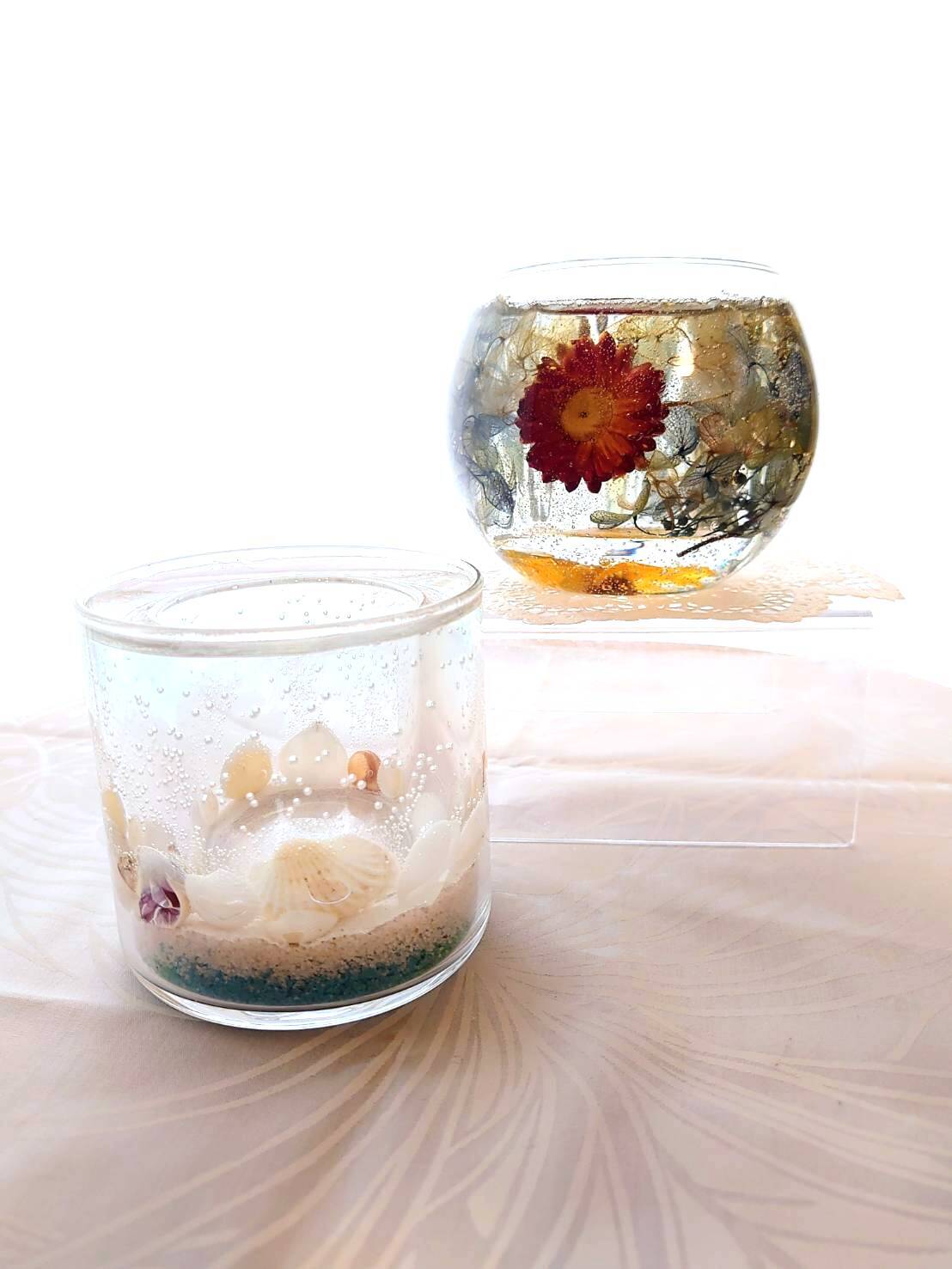 ジェルキャンドルホルダーに閉じ込めたお花や貝が炎に